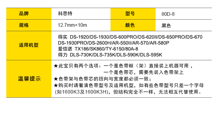 商品名称:科思特 80D-8色带架 适用得实DS-1920/DS-1930/DS-600PRO/DS-620II/DS-650PRO 黑色