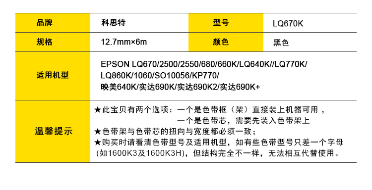 商品名称:科思特LQ670K色带芯 适用爱普生打印机680K 660K 640K 770K 860K 2500 2550