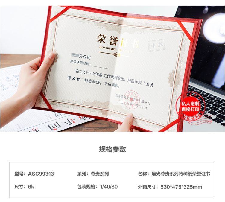商品名称:晨光尊贵特种纸荣誉证书6K ASC99313
