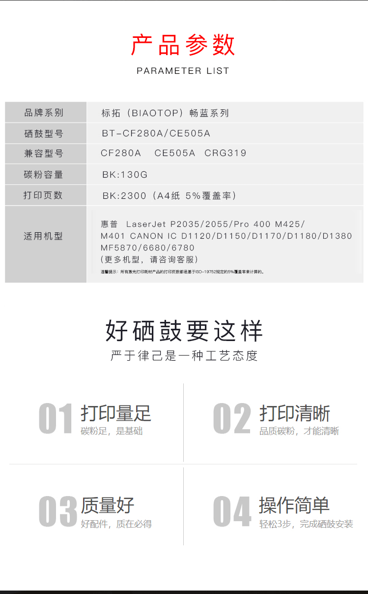 商品名称:标拓 (Biaotop)畅蓝系列 CE505A/CF280A 适用于:惠普HP400/M401DN/P2035/425dn/P2035n/P2055dn