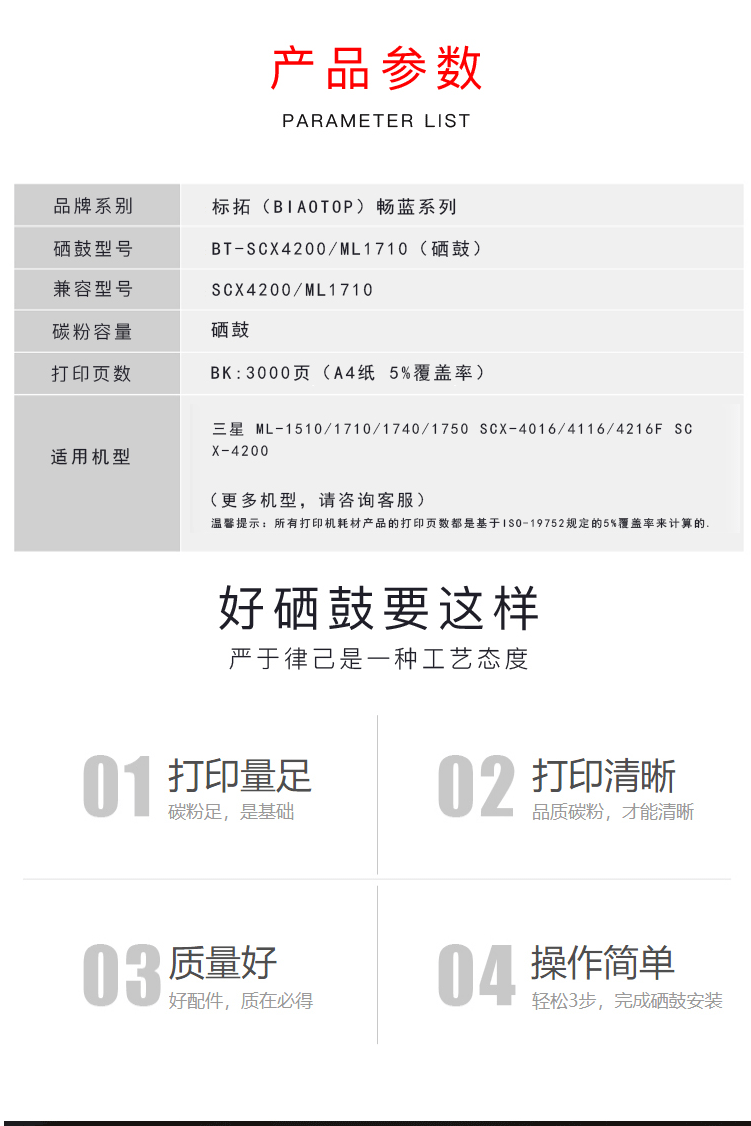 商品名称:标拓 (Biaotop)畅蓝系列 SCX4200/ML1710硒鼓 适用于:三星ML-1510/1710/1740/1750 SCX-4016/4116SCX-4200