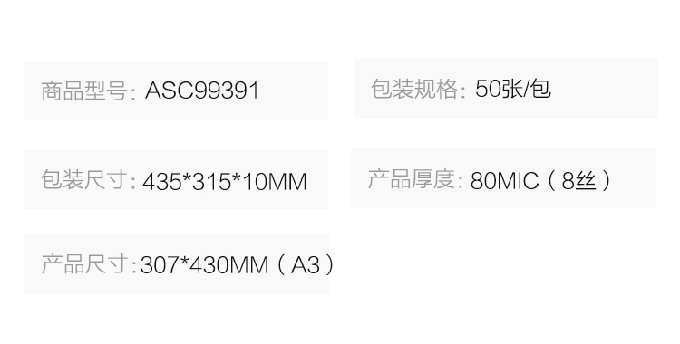 商品名称:晨光A3塑封膜(80mic)50张ASC99391