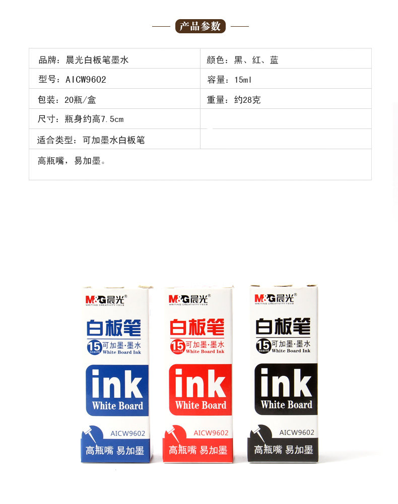 商品名称:晨光15ml白板笔可加墨墨水AICW9602黑20瓶装