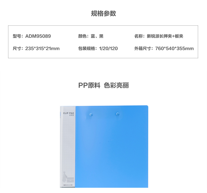 商品名称:晨光A4新锐长押+板夹文件夹蓝ADM95089