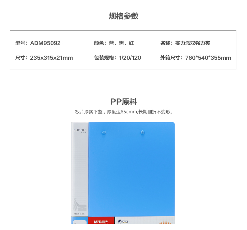 商品名称:晨光A4实力派双强力文件夹蓝ADM95092