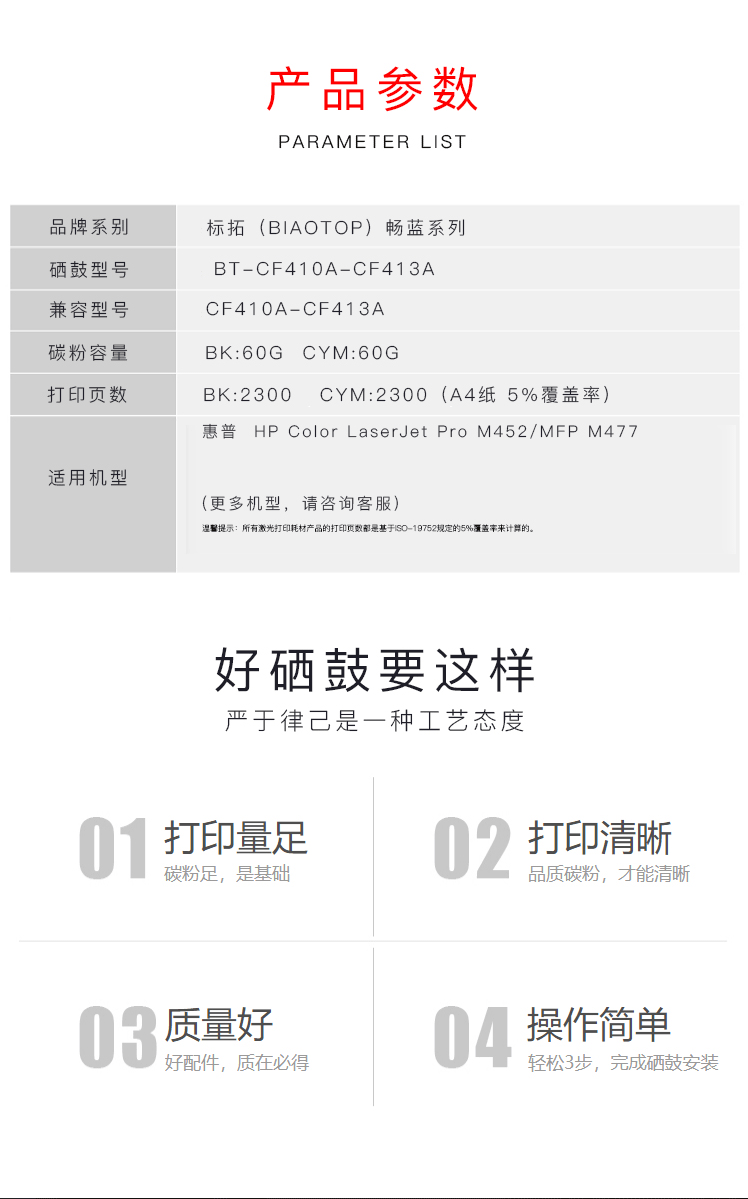 商品名称:标拓 (Biaotop)畅蓝系列 CF410A黑色硒鼓 适用于:HP Color LaserJet Pro M452/MFP M477