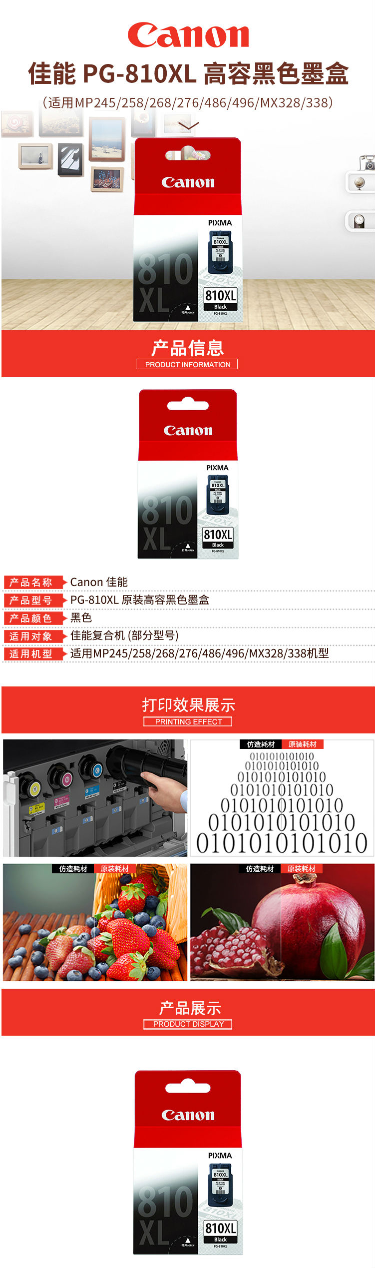 商品名称:佳能(Canon)PG-810XL 黑色墨盒(适用于:腾彩PIXMA MP245 /腾彩PIXMA MP258 /腾彩PIXMA MP268 )