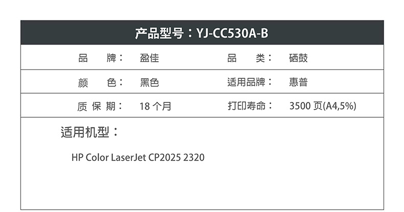 商品名称:盈佳YJ CC530A(304A)黑色硒鼓(带芯片) 适用:HP Color LaserJet CP2025 2320