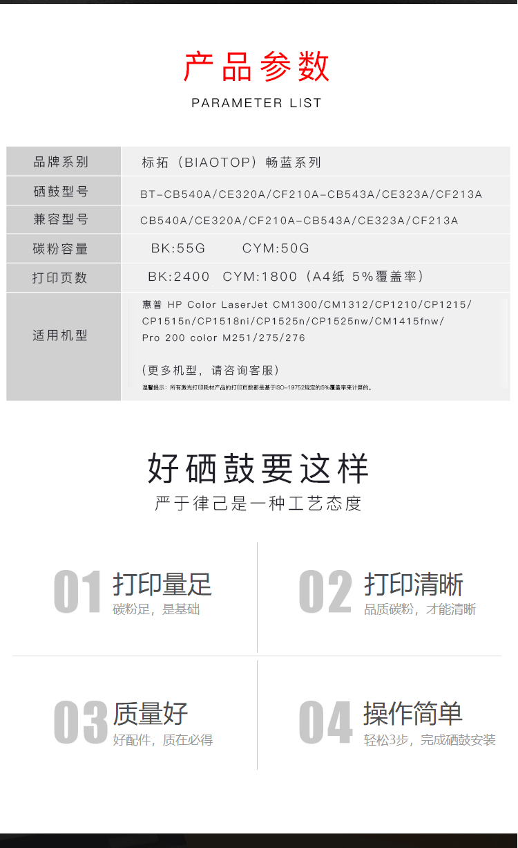 商品名称:标拓 (Biaotop)畅蓝系列 CB540A/CE320A/CF210A黑色硒鼓 适用于:惠普 CM1300/1312/CP1210/1215/1515n