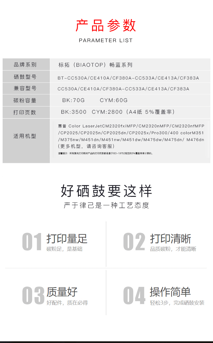 商品名称:标拓 (Biaotop)畅蓝系列 CC532A/CE412A/CF382A黄色硒鼓 适用于:惠普CM2320nMFP/CP2025/Pro300/400