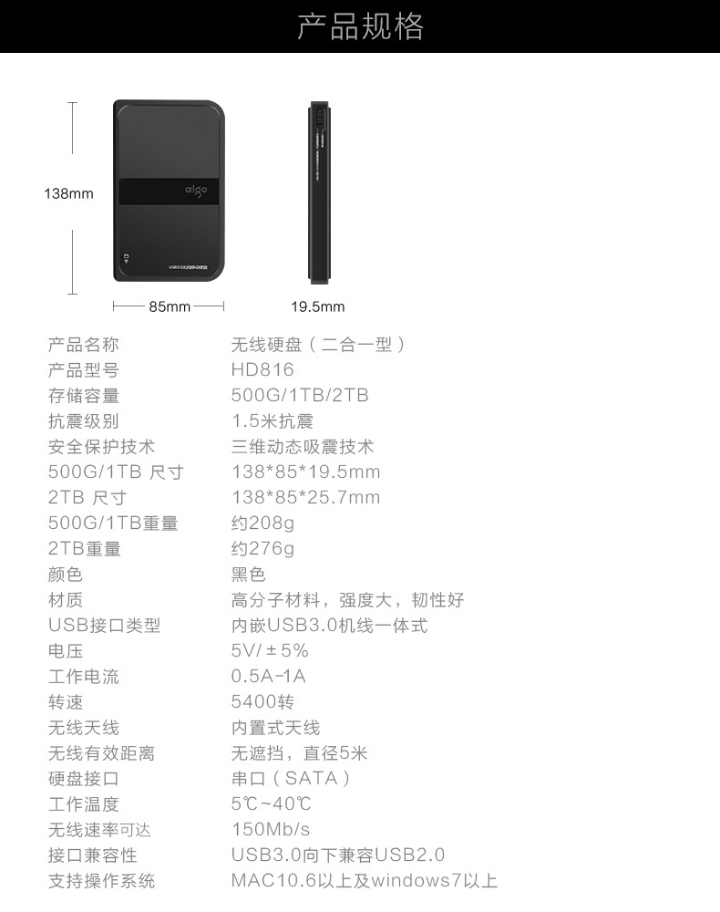 商品名称:爱国者(aigo) HD816 移动硬盘 高速USB3.0超薄抗震防摔 HD816/ 1TB