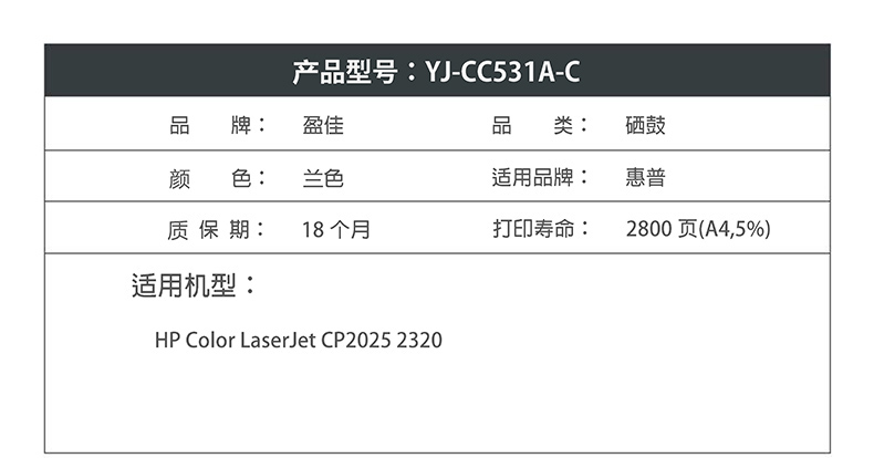 商品名称:盈佳YJ CC531A(304A)兰色硒鼓(带芯片) 适用:HP Color LaserJet CP2025 2320