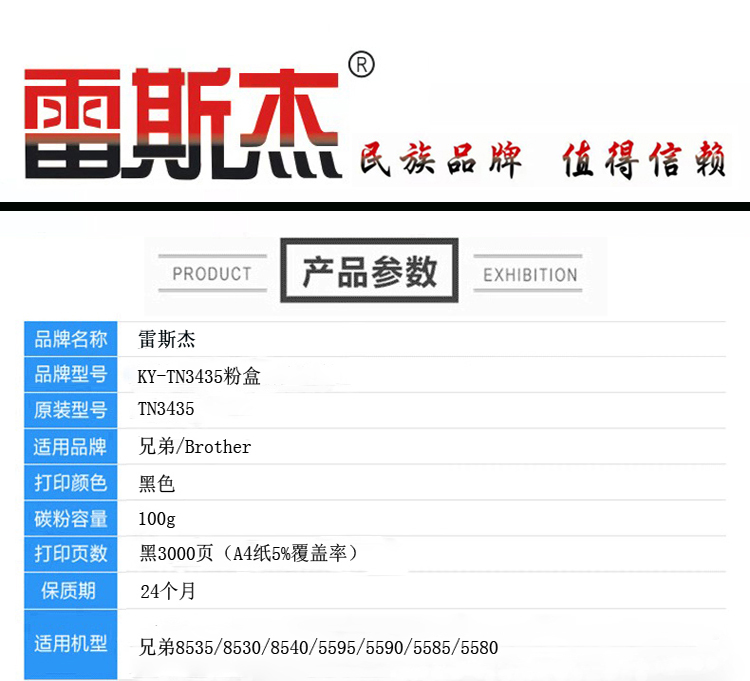 商品名称:雷斯杰 KY-TN3435 黑色粉盒 适用兄弟:8535/8530/8540/5595/5590/5585/5580