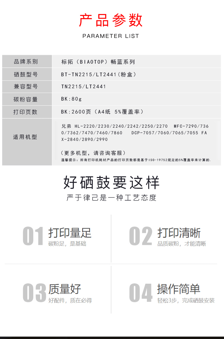 商品名称:标拓 (Biaotop)畅蓝系列 TN2215/LT2441粉盒 适用于:兄弟DCP7057/MFC7360/HL2240/7400/LJ2400L