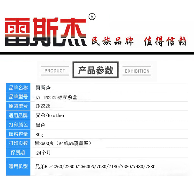 商品名称:雷斯杰 KY-TN2325 黑色粉盒标准型 适用兄弟:HL-2260/2260D/2560DN/7080/7180/7380/7480/7880
