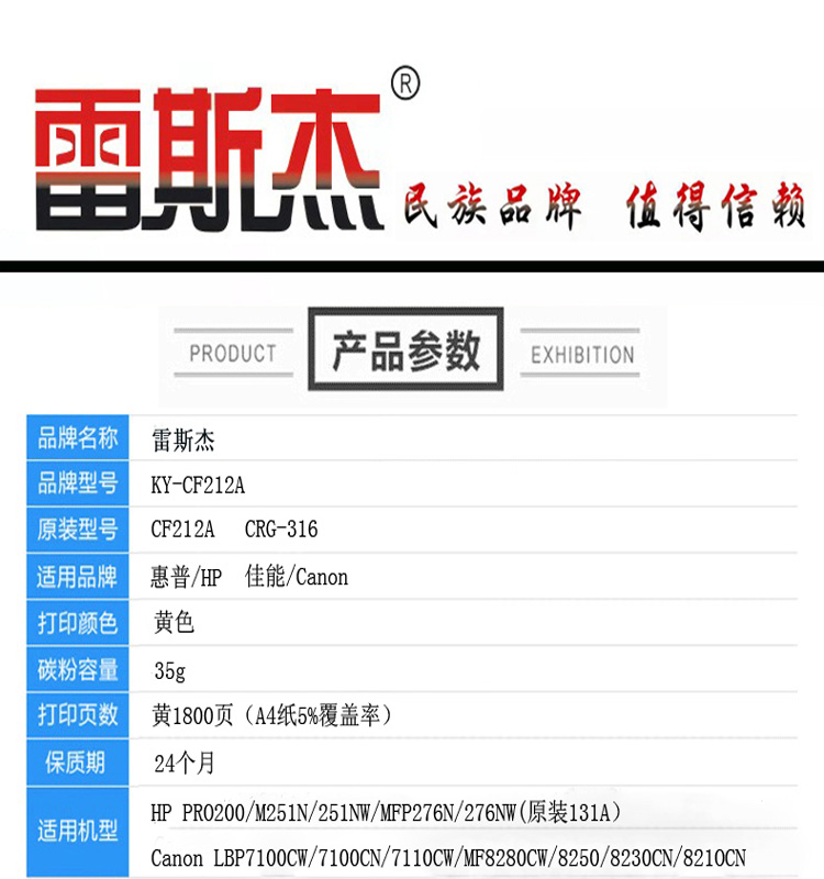 商品名称:雷斯杰 KY-CF212 黄色硒鼓 适用惠普:HP pro200/M251N/251NW/MFP276N/276NW
