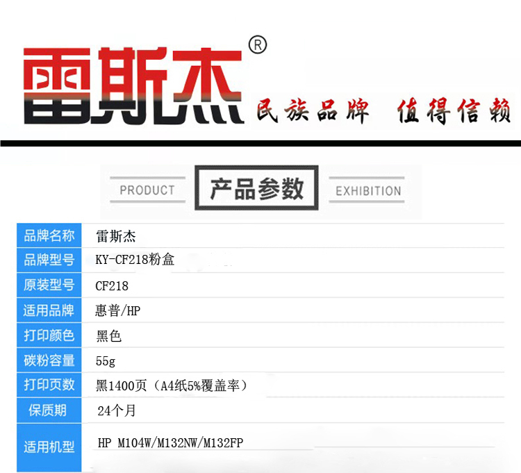 商品名称:雷斯杰 KY-CF218 黑色粉盒(带芯片)适用惠普:HP M104W/M132NW/M132FP