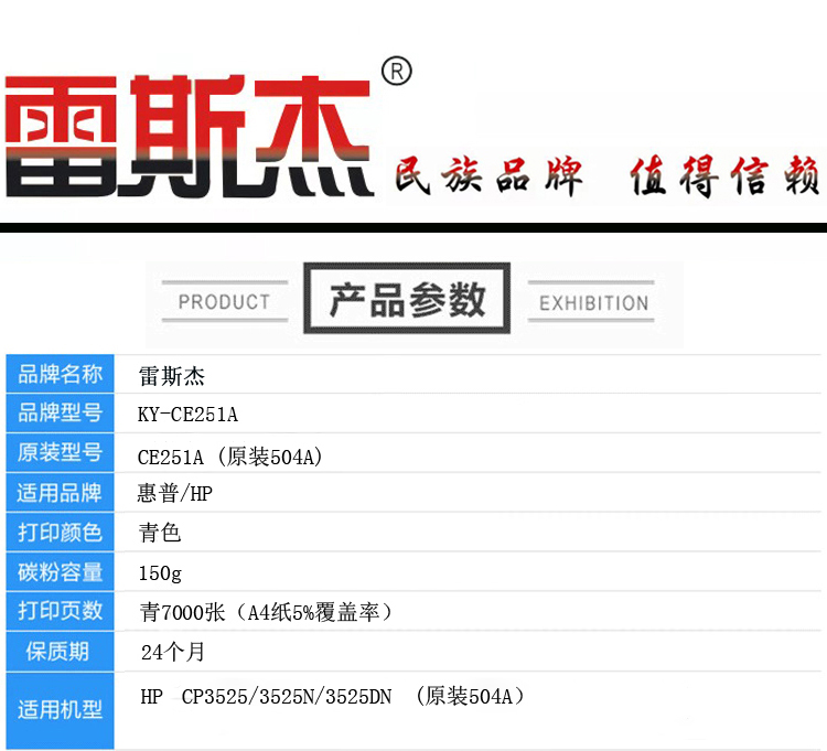 商品名称:雷斯杰 KY-CE251蓝色硒鼓 适用惠普:HP CP3525/3525N/3525DN