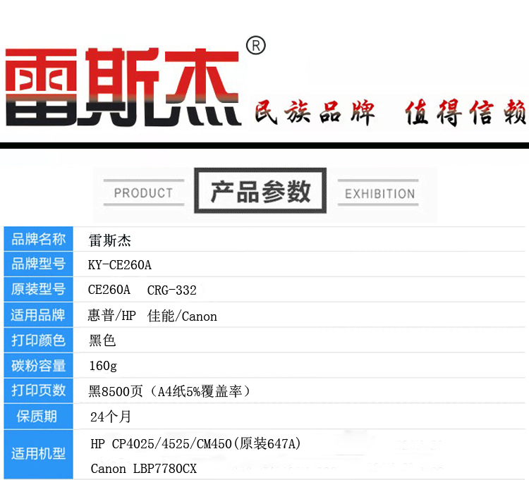 商品名称:雷斯杰 KY-CE260黑色硒鼓 适用惠普:HP CP4025/4525/CM450/CanonLBP7780CX