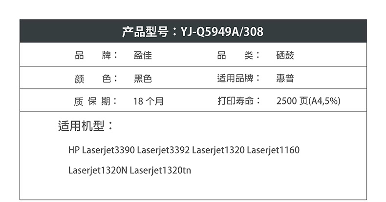 商品名称:盈佳YJ Q5949A/308黑鼓(带芯片) 适用机型:HP Laserjet3390 Laserjet3392 Laserjet1320 Laserjet1160 Laserjet1320N Laserjet1320tn