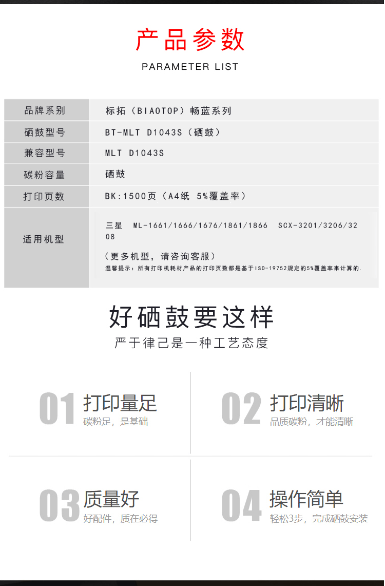 商品名称:标拓 (Biaotop)畅蓝系列 MLT D1043S硒鼓 适用于:三星ML1660/1670/1675/1673/1678SCX-3200/3205//3217