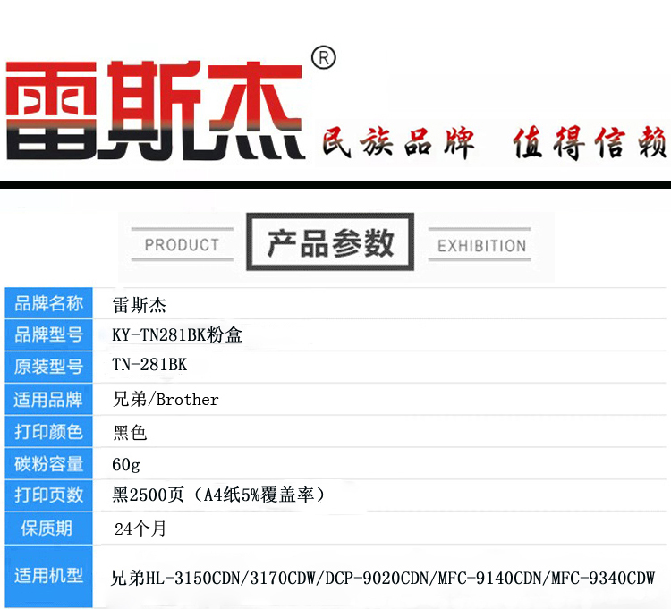 商品名称:雷斯杰 KY-TN281黑色粉盒 适用兄弟:兄弟HL-3150CDN/3180CDW/DCP9020CDN/MFC9140CDN/MFC9340CDW