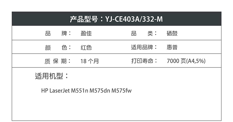 商品名称:盈佳YJ CE403A (507A)/332红鼓(带芯片) 适用机型:HP LaserJet M551n M575dn M575fw
