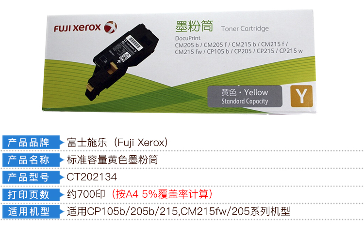 商品名称:富士施乐(Fuji Xerox)CT202136 标准容量黄色墨粉盒(适用于:CP105b;CM215fw;CM215b;CM215f;CM205b;CM205f;CP215;CP215w)