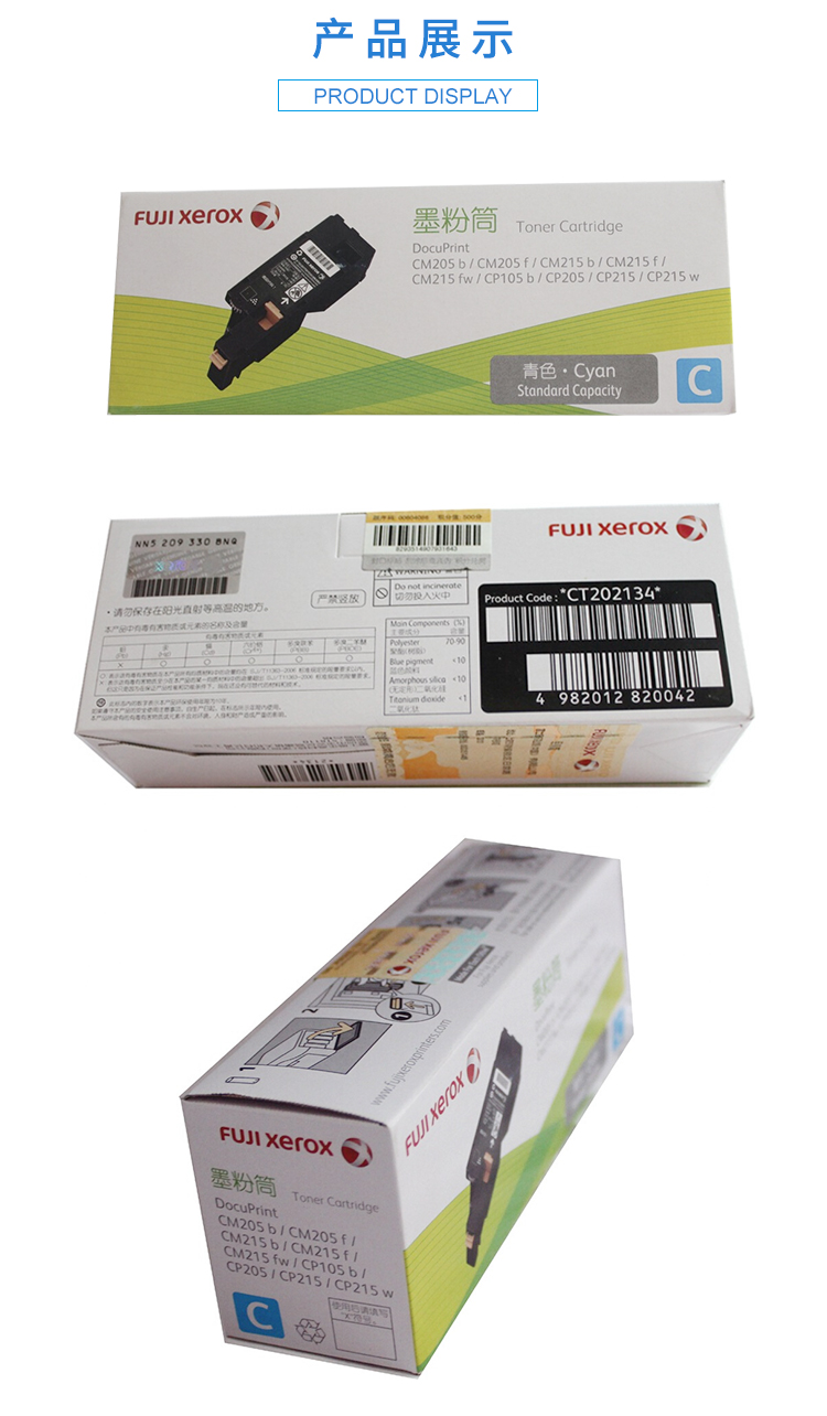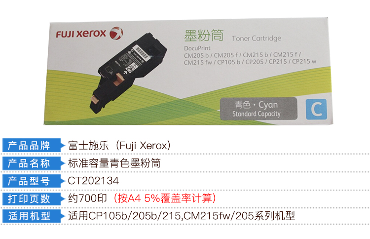 商品名称:富士施乐(Fuji Xerox)CT202134 标准容量青色墨粉盒(适用于:DocuPrint CM205b/CM205f/CM215b/CM215f/CM215fw/CP105b/CP205/CP215/CP215w)
