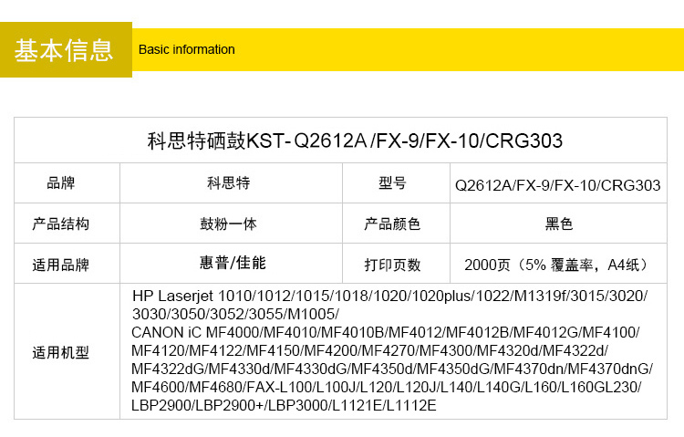 商品名称:科思特Q2612A硒鼓 适用HP LaserJet M1005 佳能FX-9 FX10 CRG303 专业版