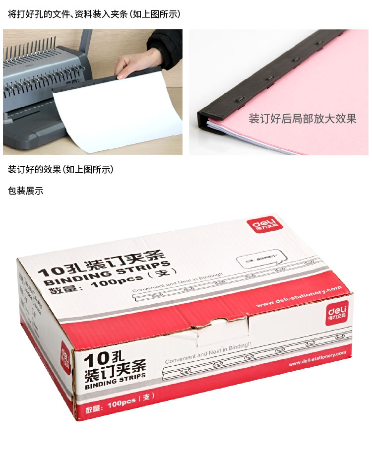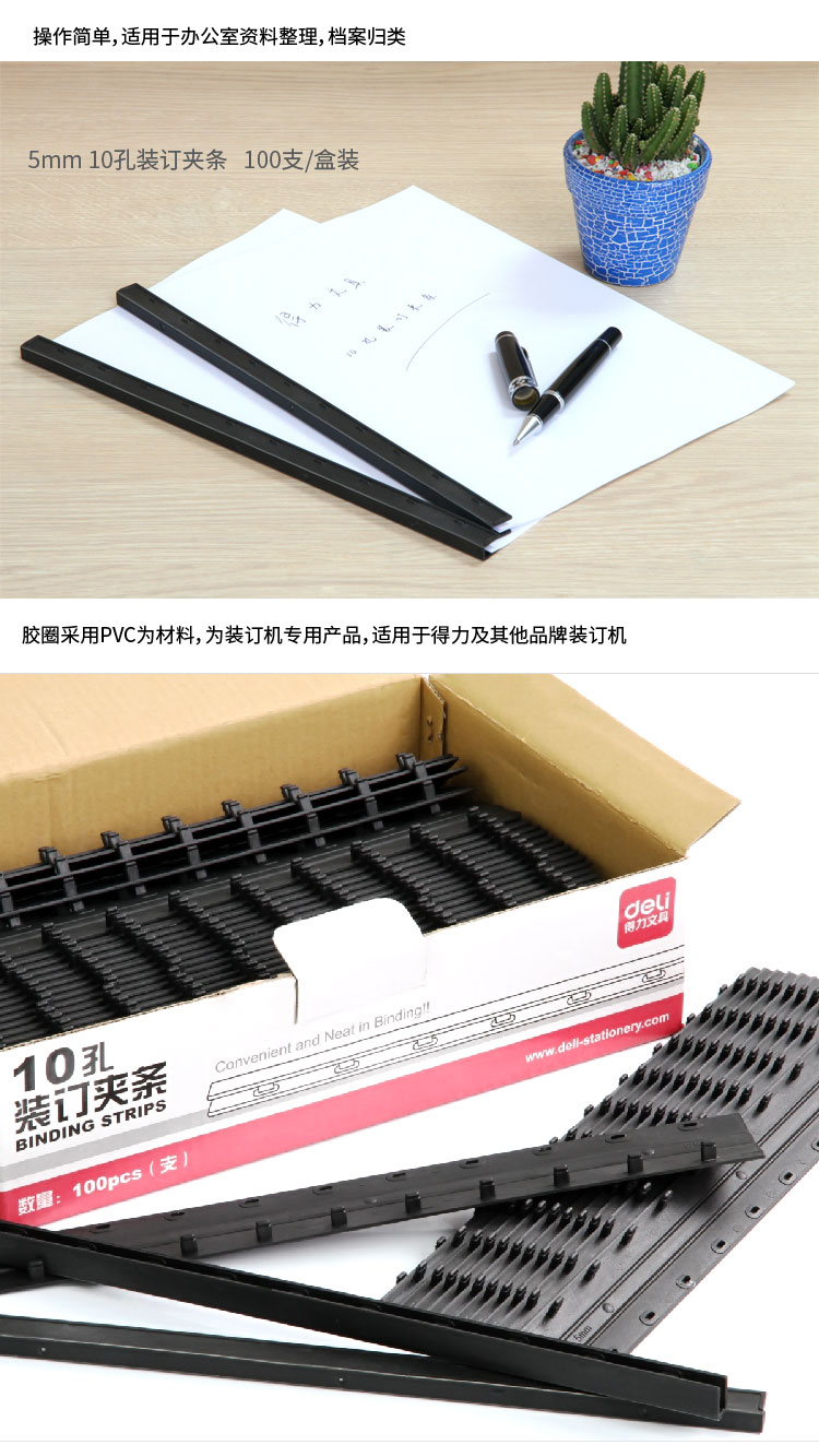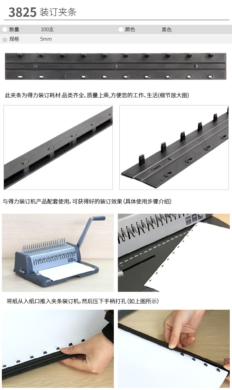 商品名称:得力3825-10孔装订夹条(黑)300*5mm(100支/盒)