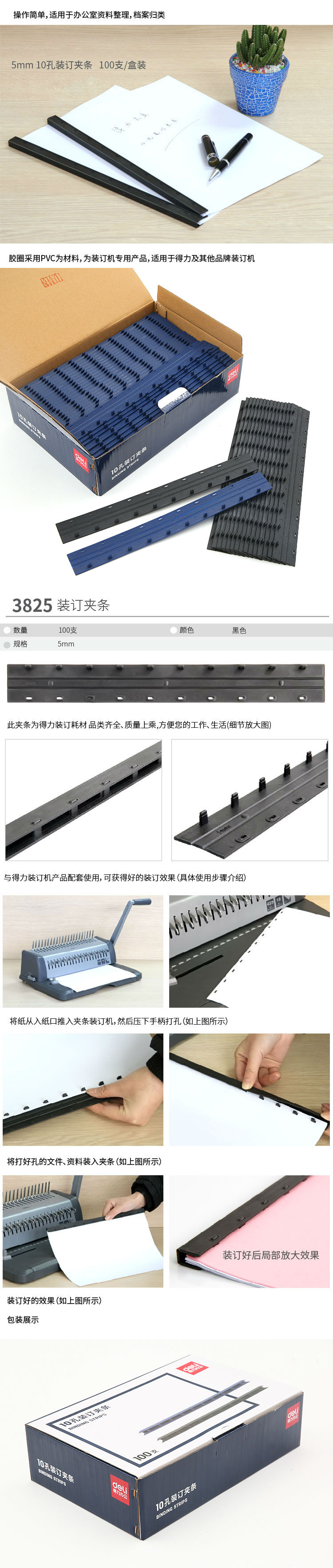 商品名称:得力3827-10孔装订夹条(黑)300*10mm(100支/盒)