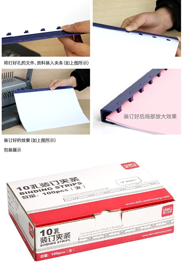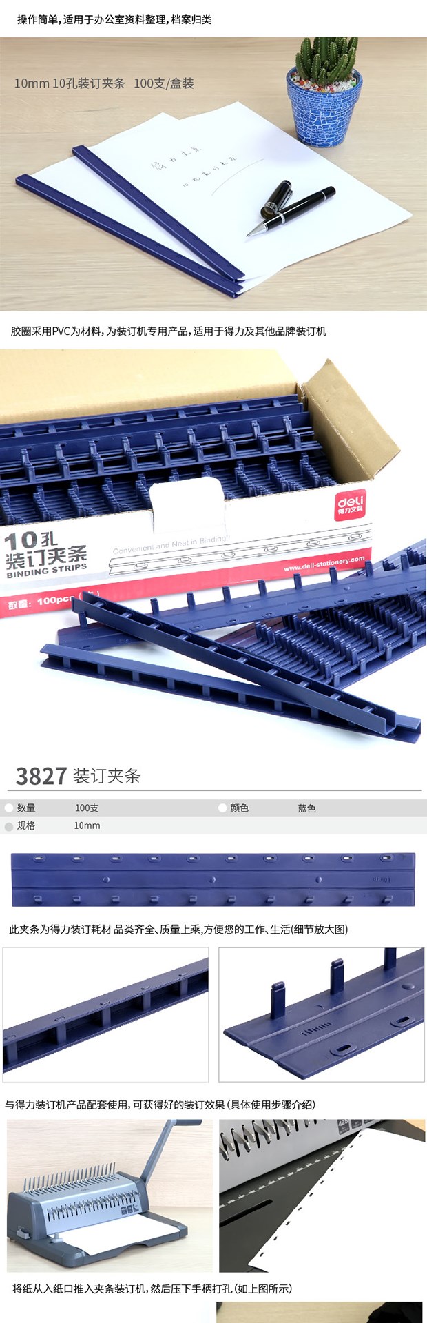 商品名称:得力3827-10孔装订夹条(蓝)300*10mm(100支/盒)