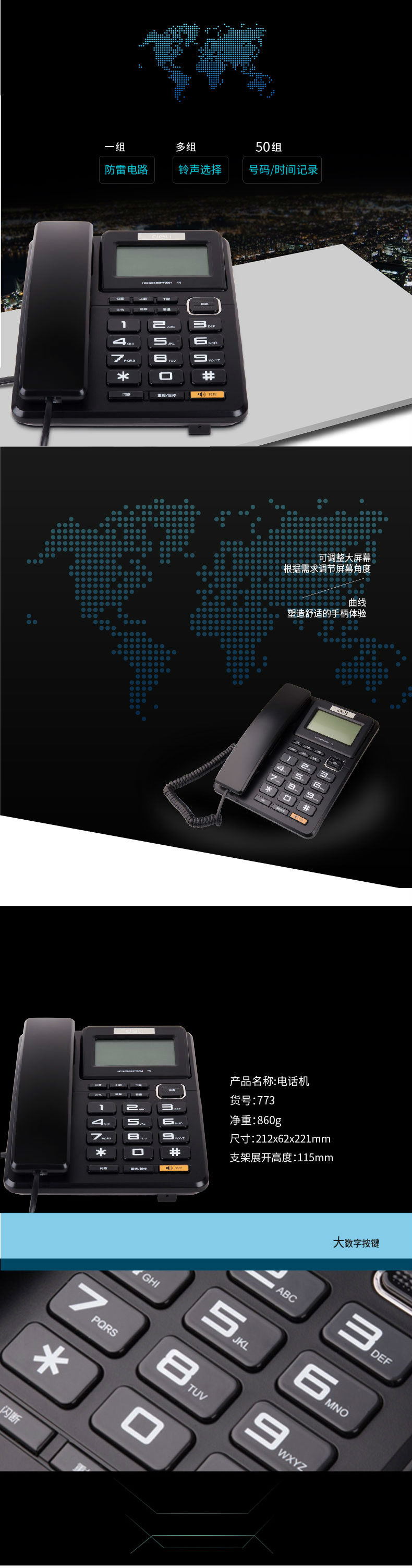商品名称:得力773电话机(黑色)(1台/盒)