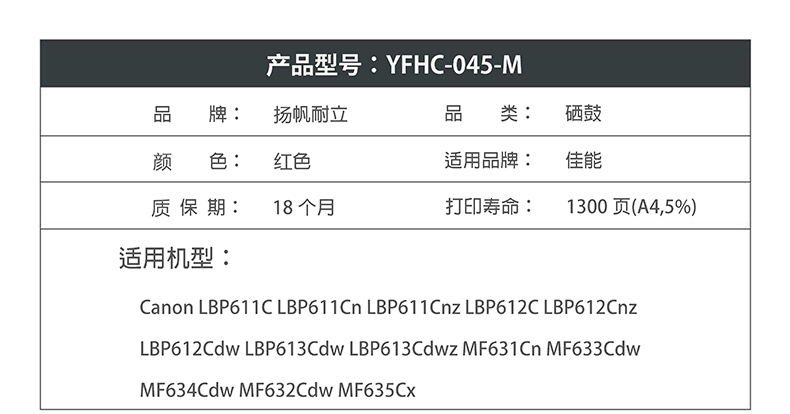 商品名称:扬帆耐立YFHC CN-045M红鼓-1.3K(带芯片) 适用于:Canon LBP611C LBP611Cn LBP611Cnz LBP612C LBP612Cnz LBP612Cdw LBP613Cdw LBP613Cdwz MF631