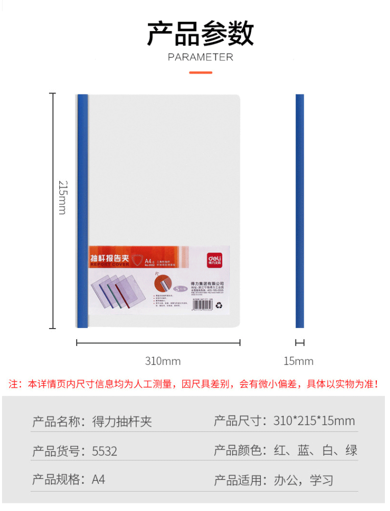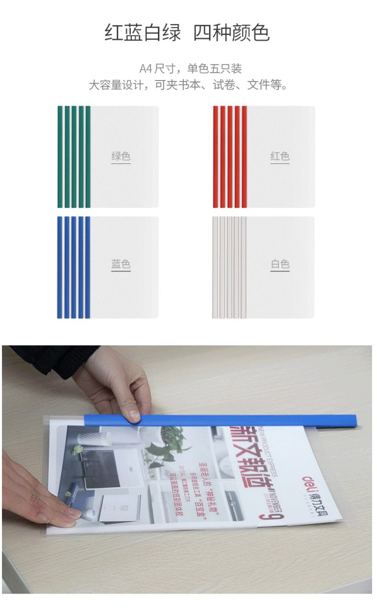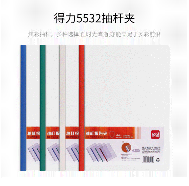 商品名称:得力(deli)5532 透明拉杆夹A4彩色加厚抽杆报告夹 背宽15mm (5只装) 颜色随机
