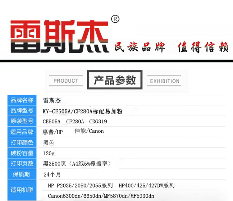 商品名称:雷斯杰 KY-CE505A(标准易加粉)黑色硒鼓 适用惠普:HPP2035/2050/2055系列