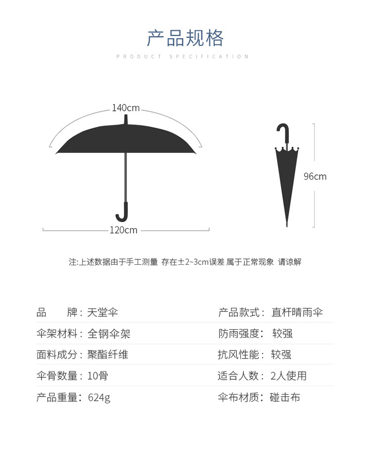 商品名称:天堂伞193E 直柄晴雨伞 黑色