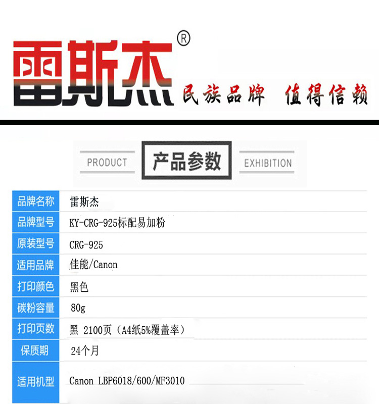 商品名称:雷斯杰 KY-CRG925(标准易加粉)黑色硒鼓 适用佳能:CanonLBP6018/600/MF3010