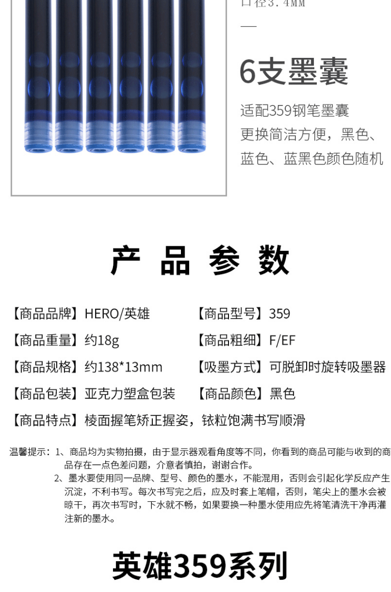 商品名称:英雄(HERO)359 正姿 磨砂黑 F尖钢笔 带墨囊