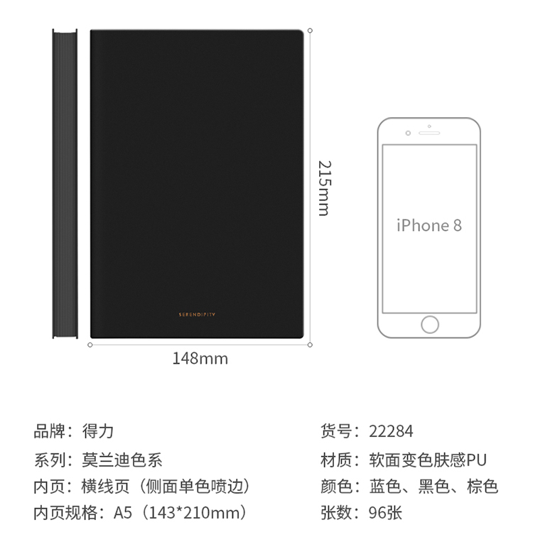 商品名称:得力22284软面贴芯皮面本-A5-210mm*143mm/96张(棕)