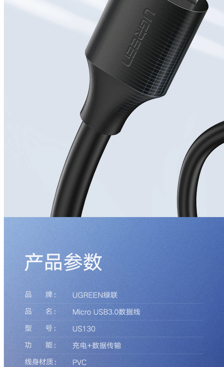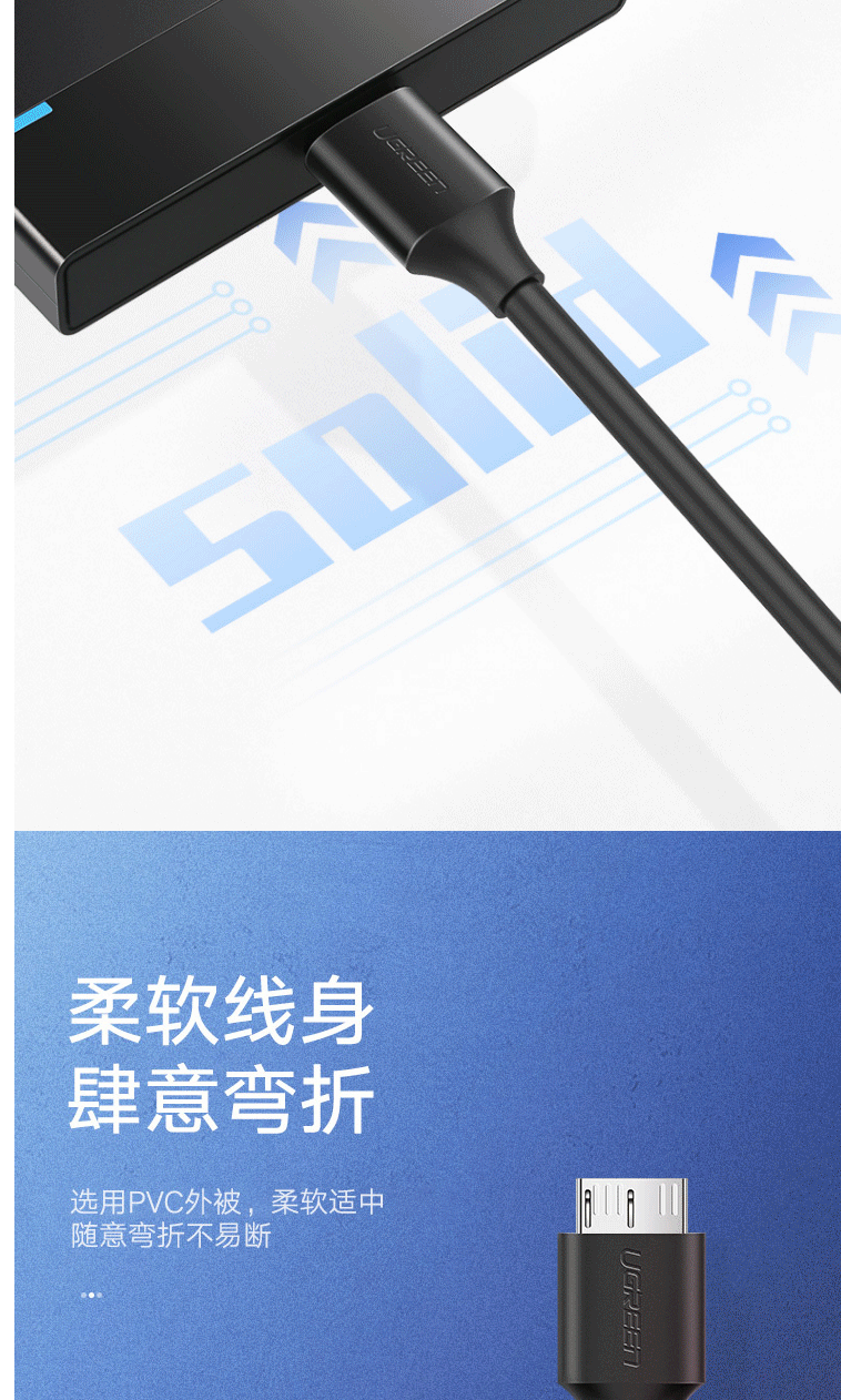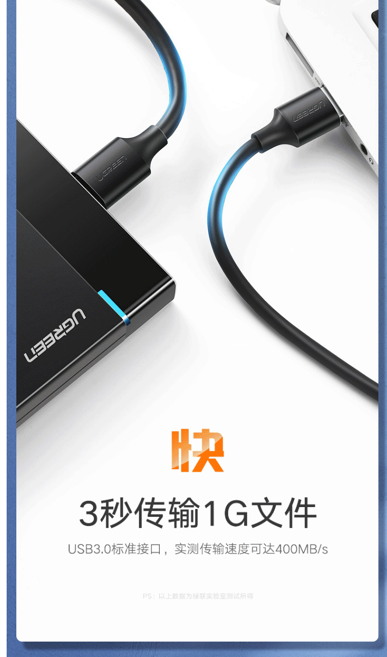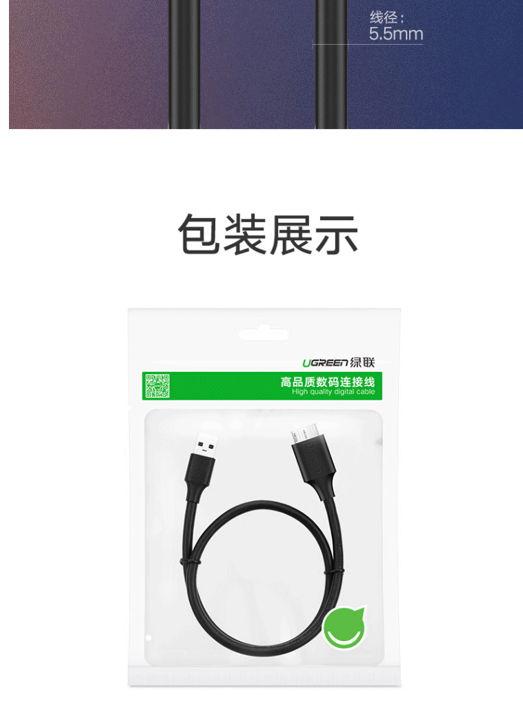 商品名称:绿联(UGREEN)移动硬盘数据连接线 Micro USB3.0高速传输 0.5米 60528