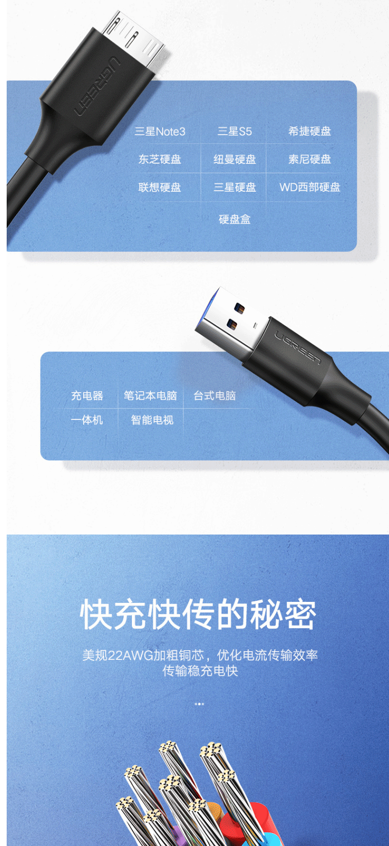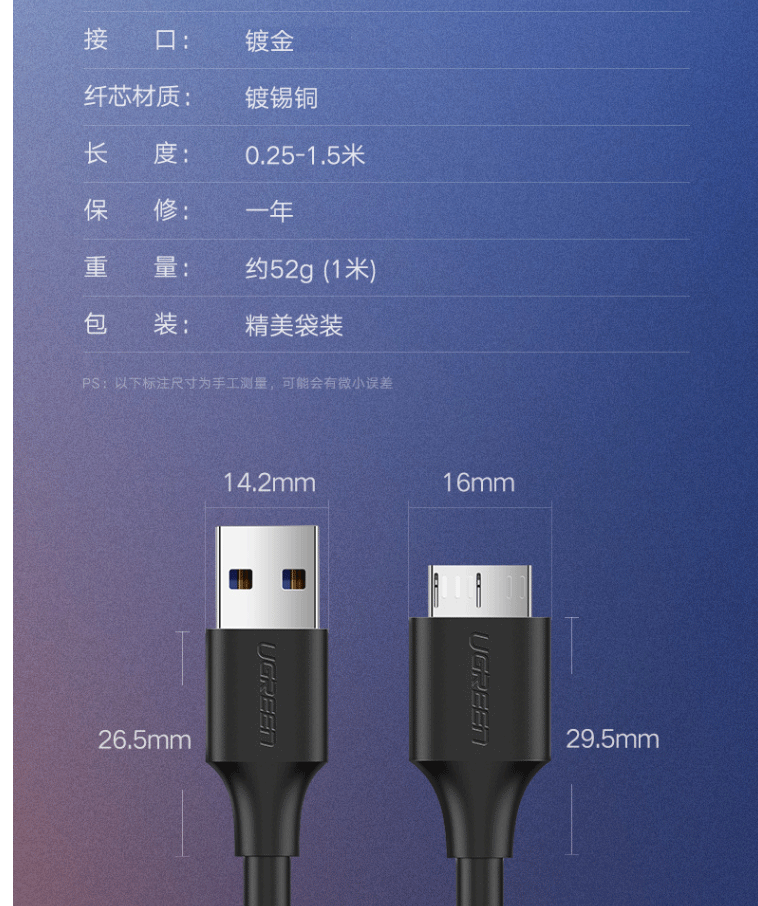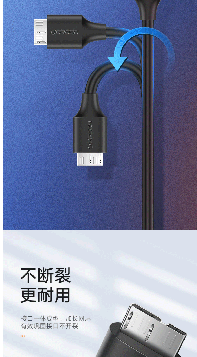 商品名称:绿联(UGREEN)移动硬盘数据连接线 Micro USB3.0高速传输 0.5米 60528