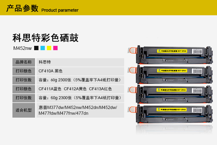 商品名称:科思特CF412A硒鼓 适用惠普M377dw M452nw/dn/dw M477fdw/fnw/dn 黄色 专业版