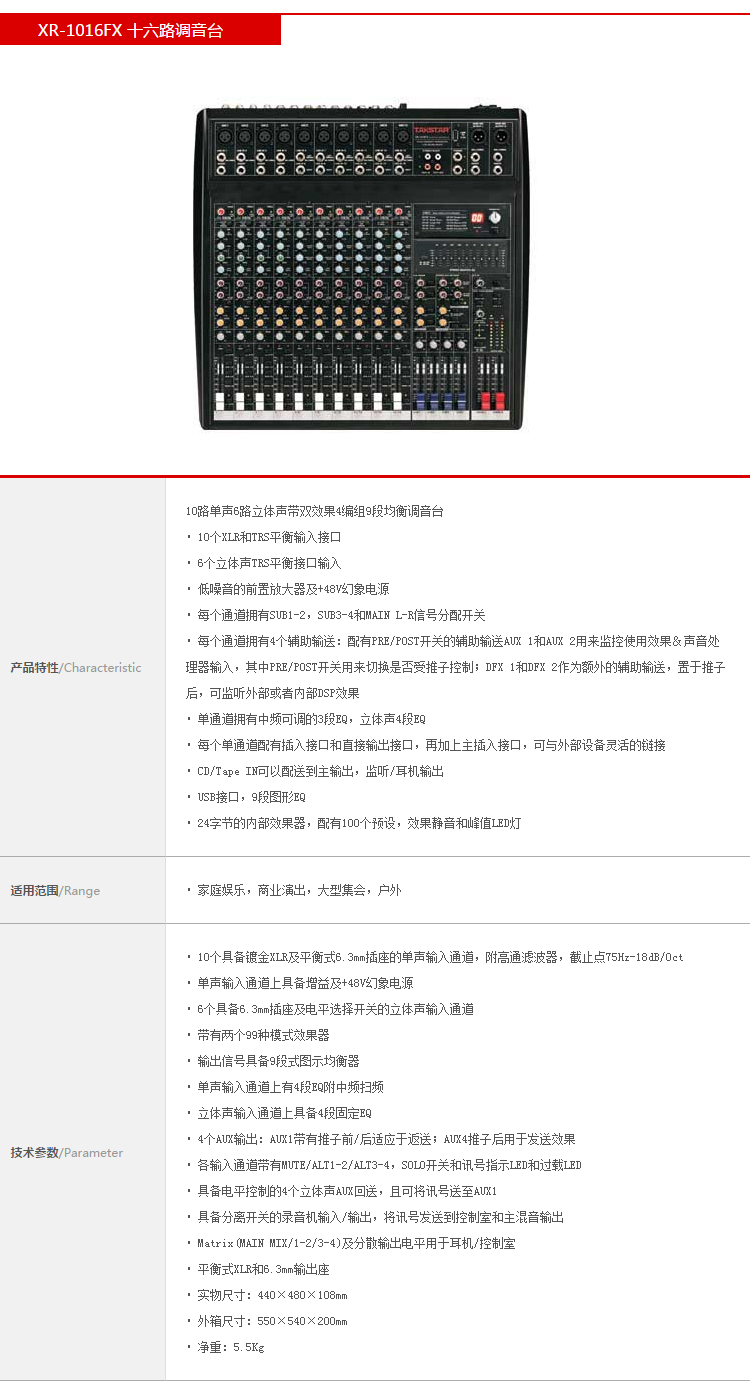 商品名称:得胜XR-1016FX 16路调音台